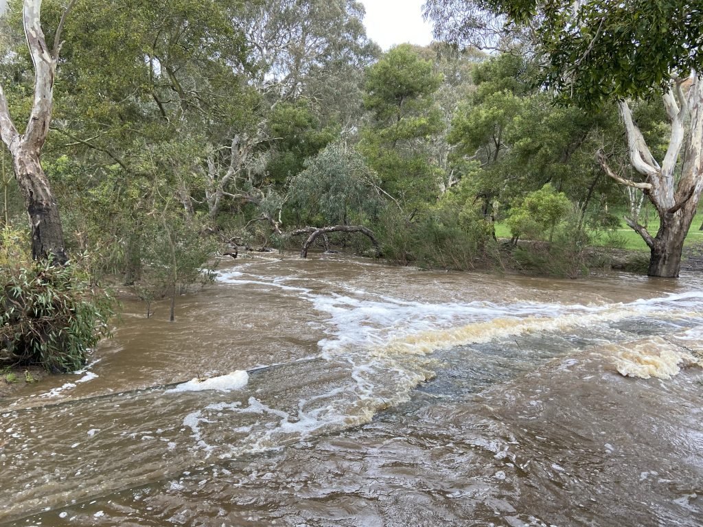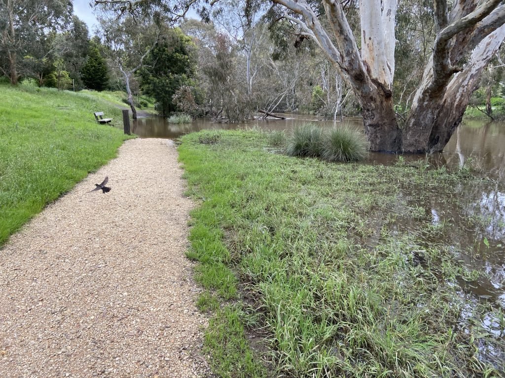 The water is around the legs of Northern Bench. In the photo you can see the big tree next to the Bench is also underwater. I startled a Blackbird and…