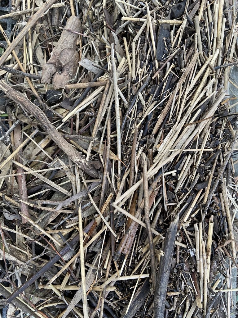 The bridge is well out of the water. It’s clear by at least a full meter. But it’s covered in piles of debris like this pile in the photo.