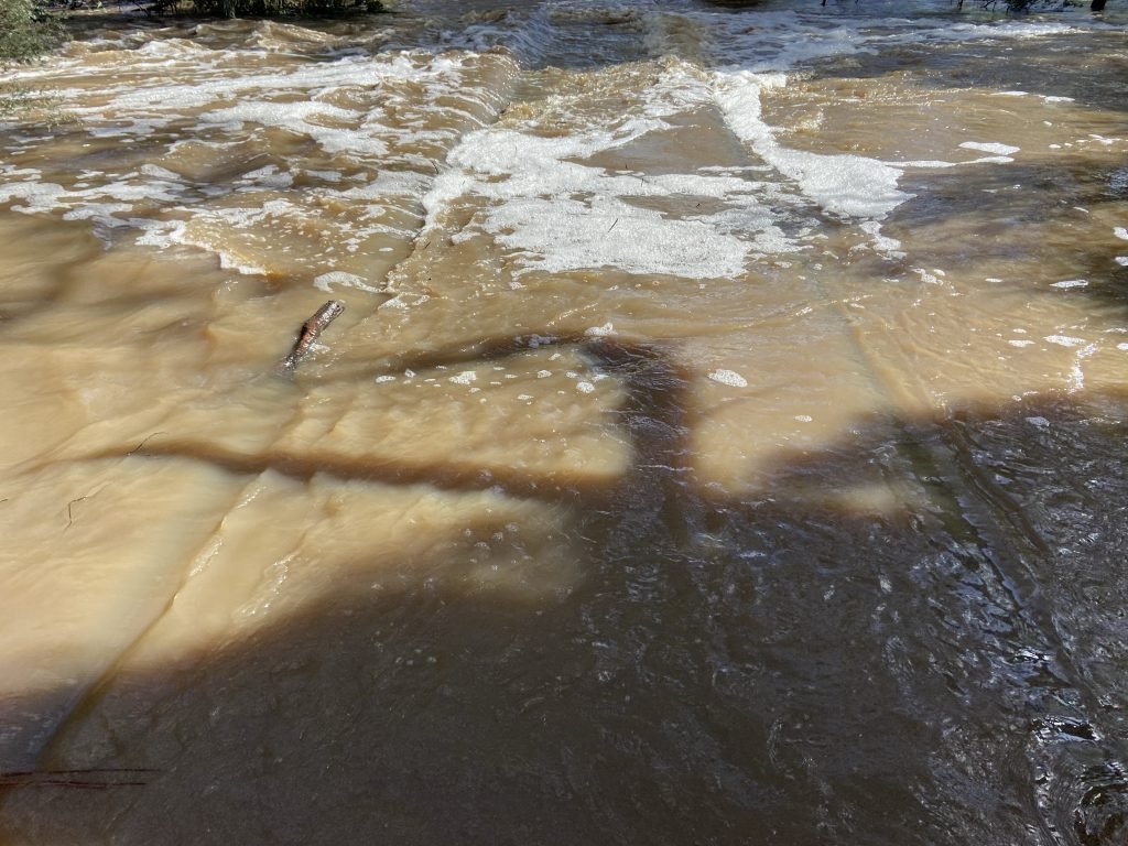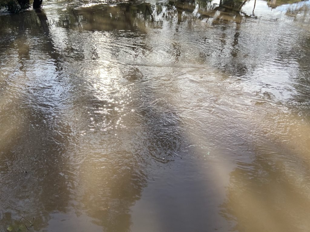 The footbridge is officially underwater today. You can still see the faint outline, and the way the flow of the water changes as it goes over the bridge.