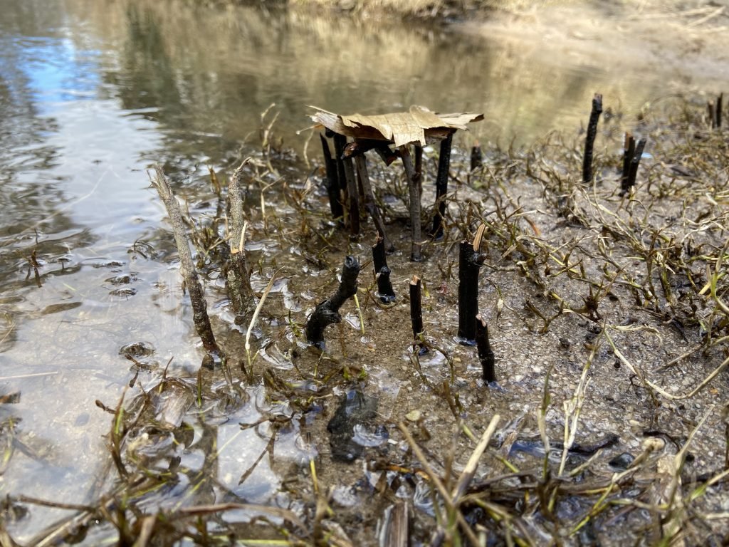 A big group of corellas just flew over me. They’re so loud! They are screeching and swooping their way up the river. My son just built these beautiful little structures…