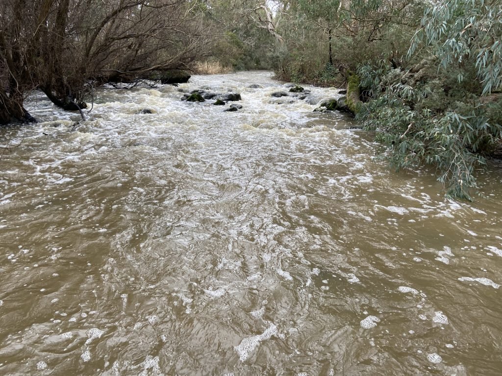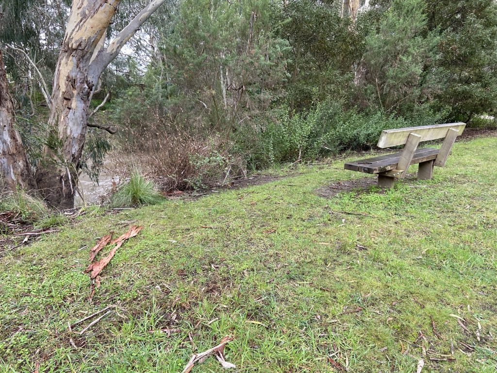 I’m here at Blue Wren Bench. The blue wrens are on the other bank. I can see them flitting around in the undergrowth. The river’s flowing swiftly. It’s usual winter…