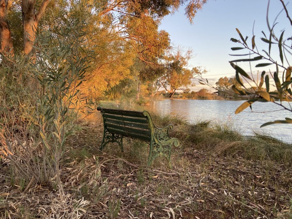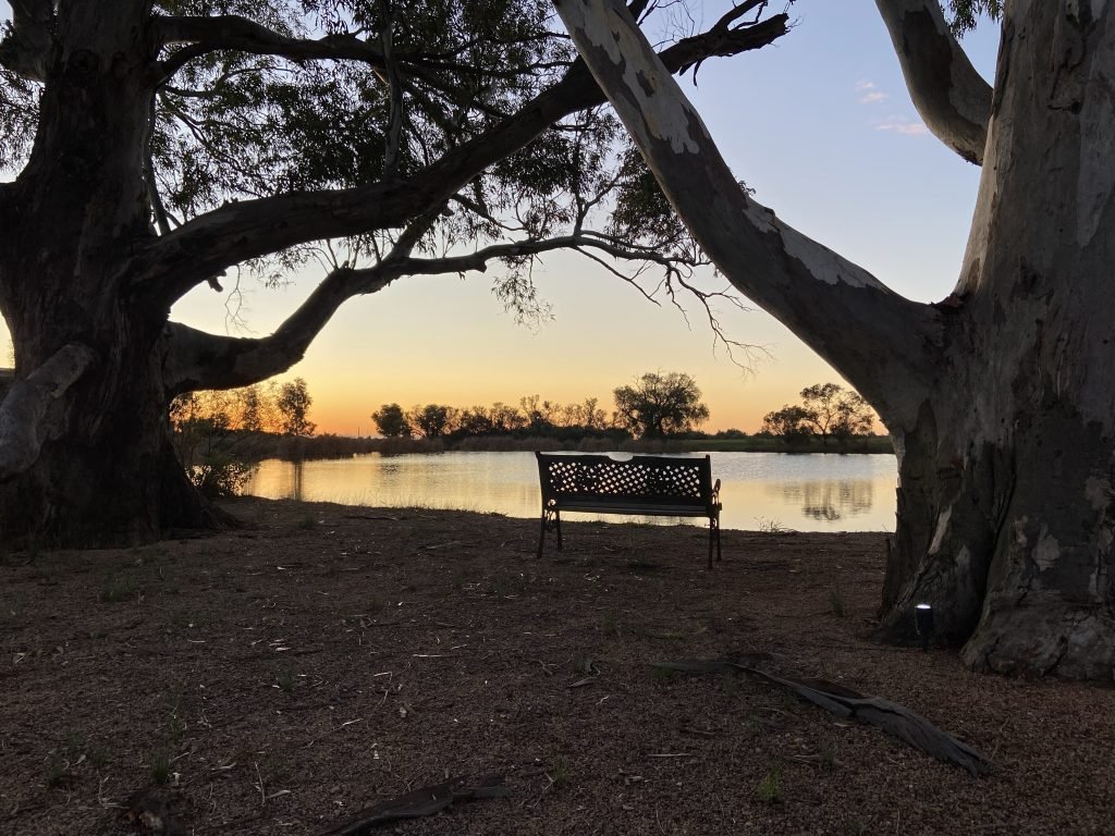 It’s sunset! It is beautiful by the pond here. We’re on holidays again. I’m going to call this Warnertown Bench One. There’s lots of crested pigeons here and when they…