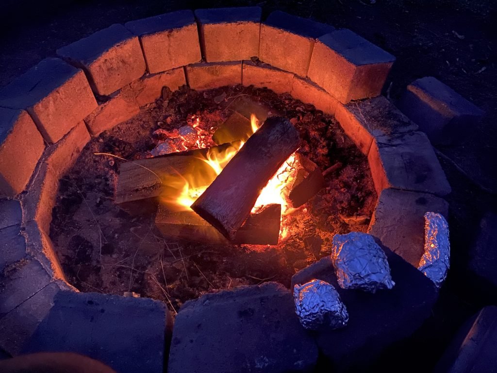 It’s sunset at the bench now, but the sky is quite stormy so we can’t see much sunset. There’s a campfire spot near the bench and we’re having a lovely…