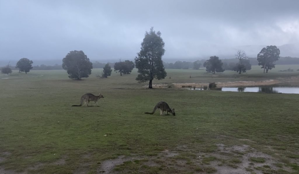 The kangaroos are completely surrounding the bench today. They are so close I can hear them munching the grass. They’re moving slowly. When they do, they use their tails almost…