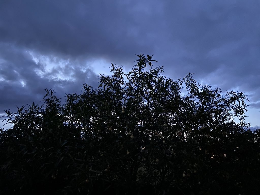 We’re just having a freak summer storm. All around us on the horizon the sky is blue, it’s been a sunny day. But right over us is this cloud and…