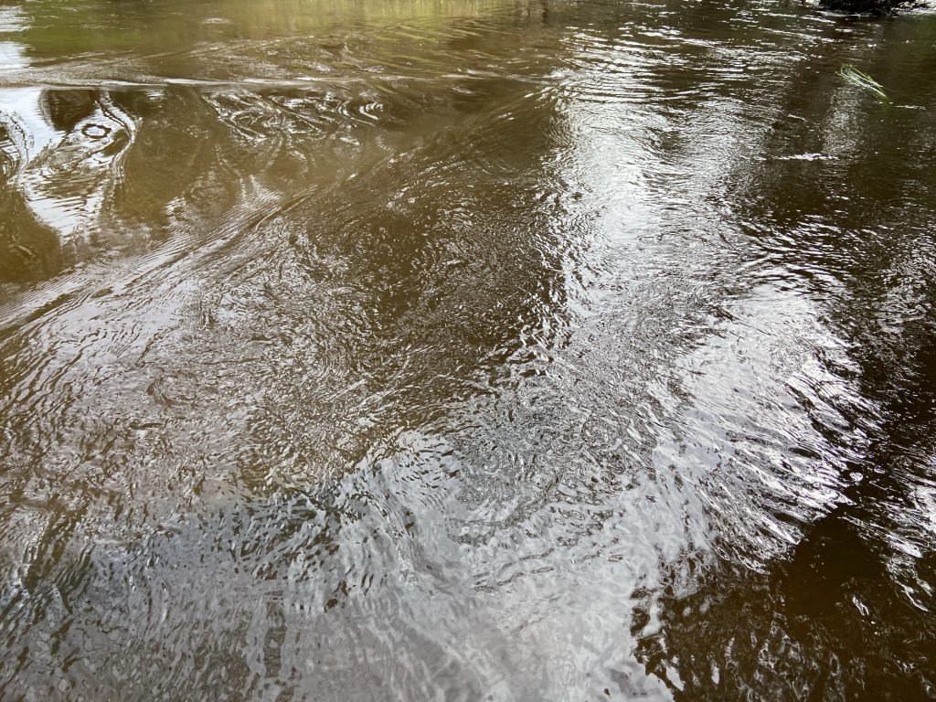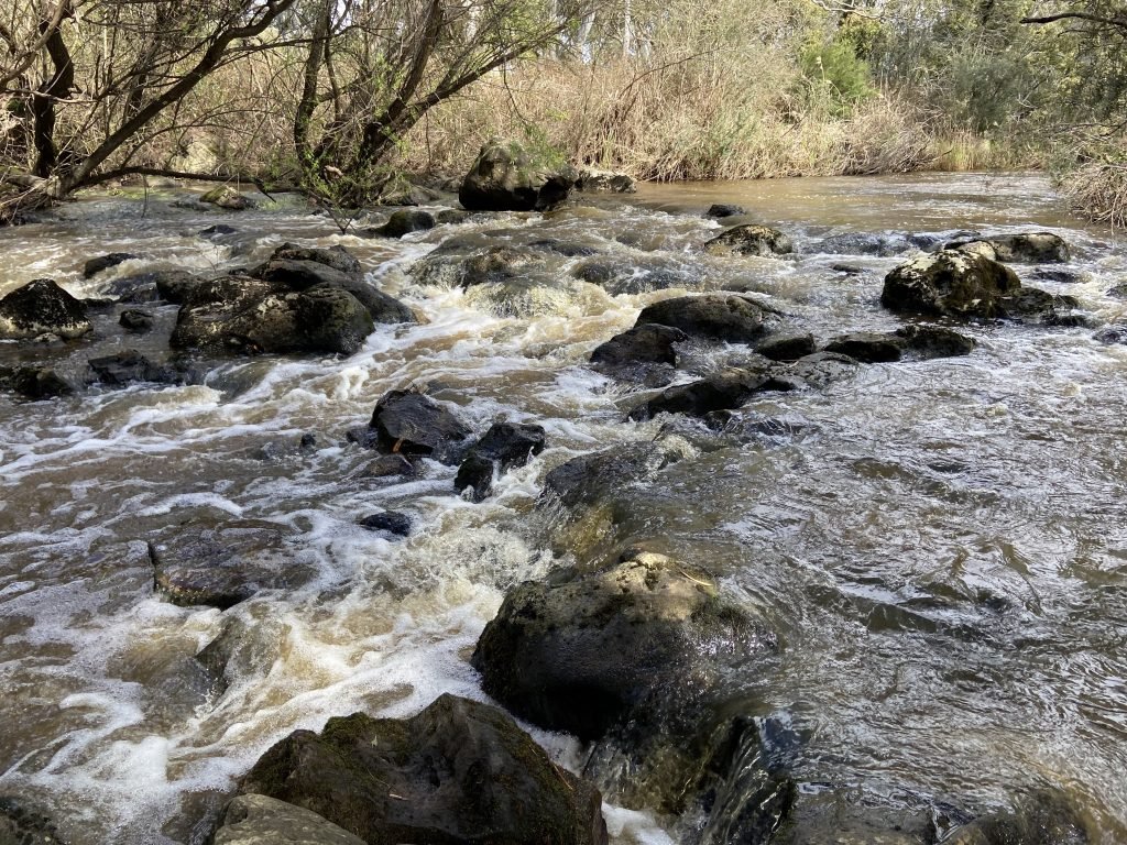 Today, the river is flowing slower. In some places it is wide, flat and brown. It’s still quite full though. There’s a Magpie here at the Other Side Bench, which…