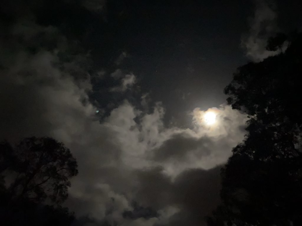 It’s another cold night at the Bench. For the first time ever, I see the moon from the Bench. It’s about three quarters full and being covered and uncovered by…