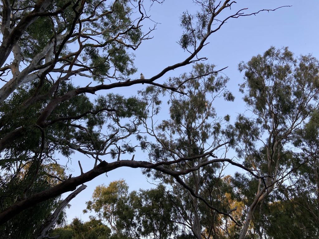 The whole flock is here! There are white birds swooping everywhere. There are white feathers all over the ground. And there is one Corella sitting unusually quietly above me. I’m…